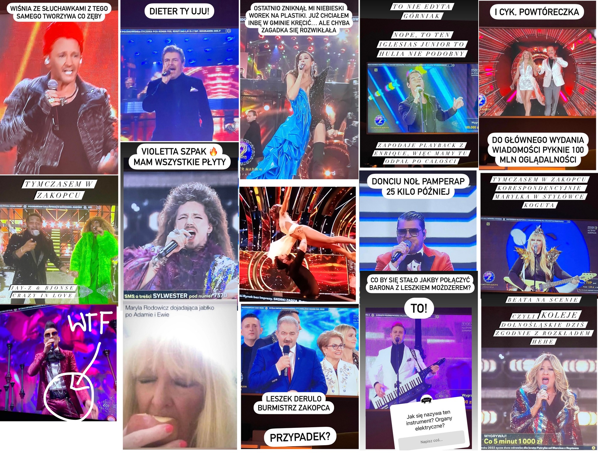 Co prawda zorganizowanie Kołczelli sprawiło, że zadłużenie Polski w ciągu jednej nocy wzrosło o 250 milionów dolarów i kara za Turów nagle zaczęła wydawać się promocyjna, ale who cares? #sylwestermarzeń Przy dobrej zabawie koszta się nie liczą. Zresztą efekt wynagrodził -> Ot zobaczyliśmy światowe gwiazdy (z poprzedniego stulecia), które wchodziły na super wypasioną scenę takim fancy tunelem jak w programie Wojewódzkiego, a podczas wykonów gwiazdom towarzyszyli tancerze z układami, że mucha nie siada. No oprawa prima sort, tymczasem na Polsacie kluczem doboru artystów prawdopodobnie były kosa z prawem -> Masz zarzuty prokuratorskie? Idealnie, bierzemy cię.